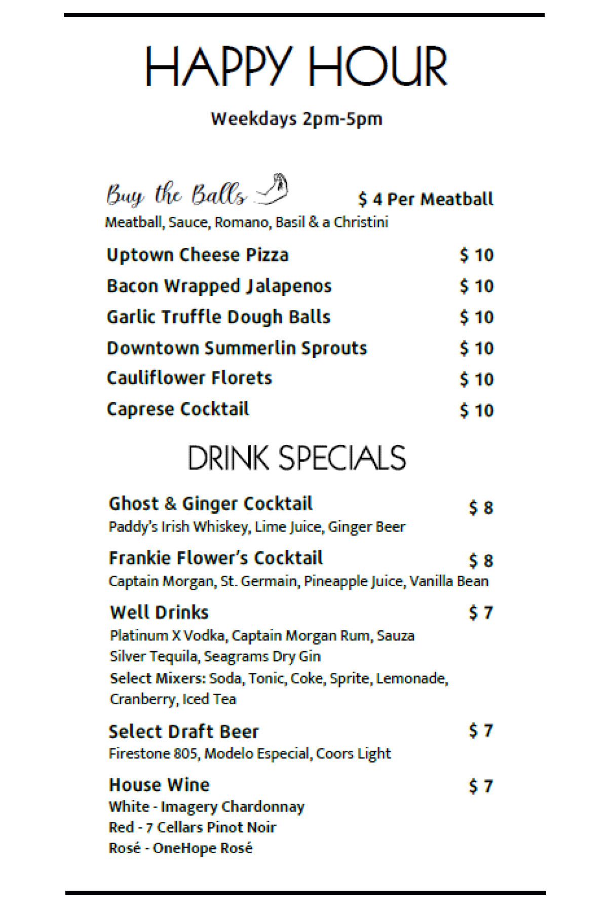 *drink specials and Happy Hour specials may change without notice. please check with your bartender or server for details.